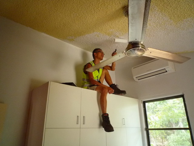 刷油漆如果是空屋而且工具足夠的話就一定會刷得很爽,但如果是裡面都已經塞滿家具,而且你只有一座一米五高的梯子的時候,你就會瘋掉。尤其在刷天花板,如果我可以把天花板旋轉成垂直於地面的話,我一定幫全天下的油漆工面免費旋轉,開甚麼玩笑!一整個搞得我脖子僵硬、頸椎痠疼,外加雙手顫抖。