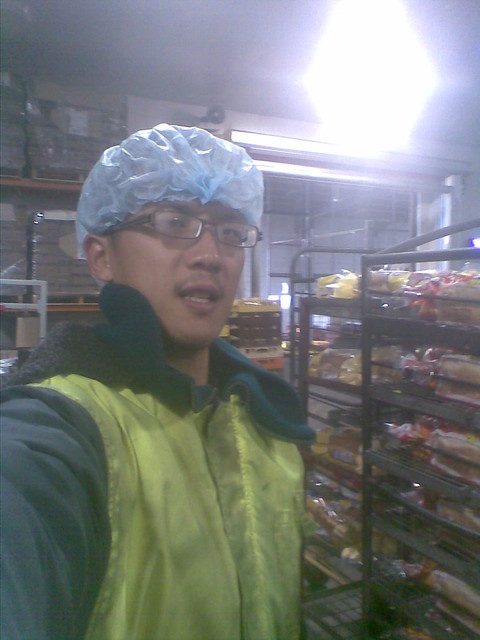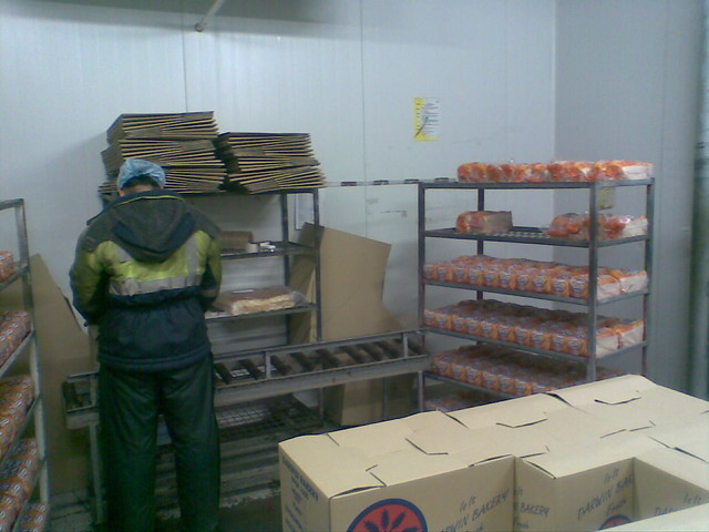 工作的內容其實還真的相當簡單,就是在四度的冷房裡面把土司裝箱,再送進零下十度的冰庫就成啦!!