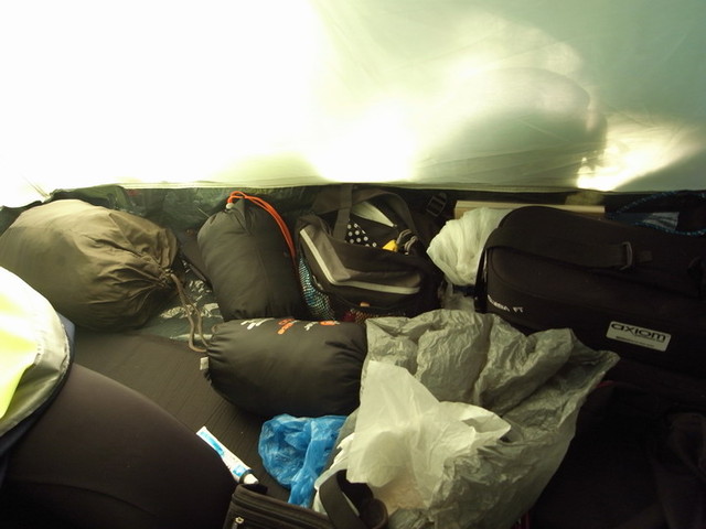 擔心妳的疼痛再加上寒冷的天氣,昨晚都是在半夢半醒間所度過,而被露水所浸濕的睡袋尾端,更讓我從恍惚的狀態逐漸轉變為清醒。將帳盟的外帳掀開,又是一個陽光普照的天空伴隨著須穿羽絨外套怪異的天氣,我輕輕的將眉頭深鎖、身軀蜷縮躲在睡袋中的妳搖醒,我用雙手將因大腿無法出力的妳扶起,在我未開口前妳就作了今天的決定...