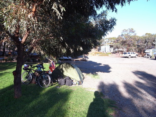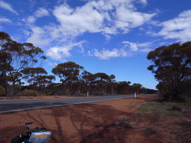 離開Widgiemooltha的路沒有區隔城市和郊外,離開的那一剎那已經騎在無垠的紅色土地光輝中。我望著還有90公里的標示出了神,心理只想著今晚將會是旅程中唯一一天已經知道過夜的設備和環境,這種熟悉是好?是壞?我說不出個所以然,『流浪』和『穩定』這兩個天平兩端的問題,讓我在完全忽略周遭的狀態下往南前進著。但可以肯定的是今晚我們可以好好的躲在一個遮風擋雨的空間裡面去吃一頓屬於"正常"的晚餐。
