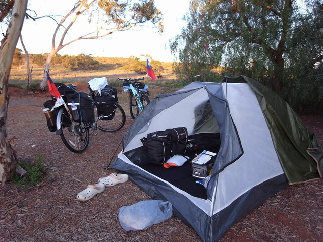 Balladonia是今天的目的地,而距離Balladonia下個有"人"的點則是260公里後的事情。溫暖的日光和微微的順風讓我精力十足的面對今天的開始,至於休假後如何去分配那兩百多公里行程的煩惱,則是老早就被我丟到背後那一望無際的平原當中~
