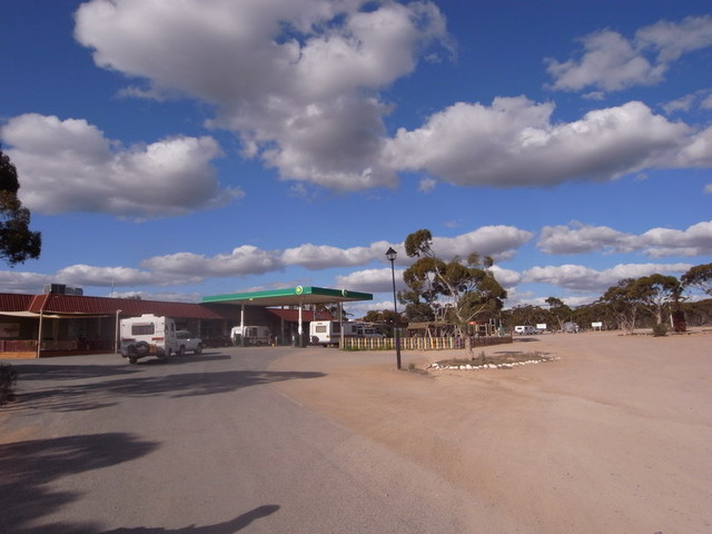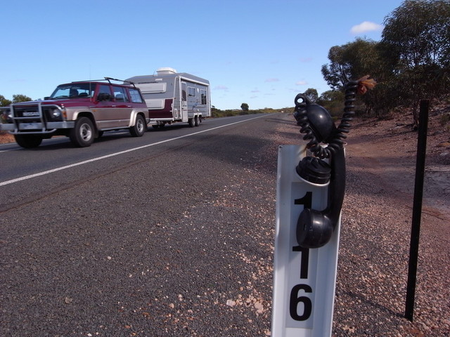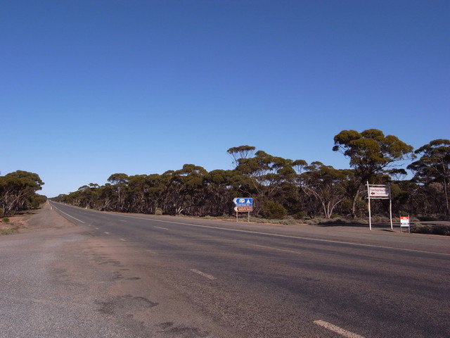 Balladonia,Eyre Highway(艾爾公路)上的第一個休息站,也可以算是最後一個,對西進的人而言是一個不小的解脫,因為這代表了他們即將離開了澳洲最大的沙漠平原;但對東征以雪梨為終點的我們而言,就代表著【現在才要開始】。Balladonia原來建立於1897年距離現在位址約28公里的地方,在1897~1929年時曾經是Perth(伯斯)和Adelaide(阿德雷德)間的電報中心之一,但讓Balladonia聲名大噪卻是發生在1979年,美國太空總署的太空實驗室墜毀在其附近,這個事件在當時引起了全世界的注意,也無意間讓Balladonia躍上了國際新聞的舞台上。而今的Balladonia在建築物內設置了一座小型的博物館記錄了這一世紀來關於它的點點滴滴,使得Balladonia成為澳洲少數擁有博物館的道路休息站(roadhouse)之一。