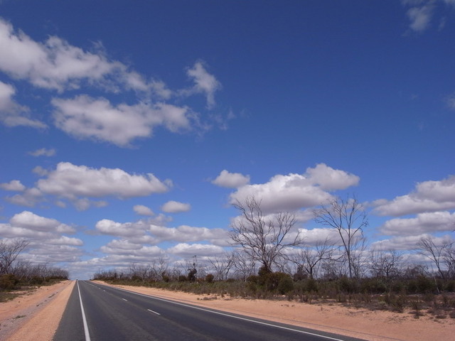 順風的天氣讓我們在不算崎嶇的路面保持著極快的速度往Balladonia的方向前進,我從剛剛之後就開始不斷的注意有沒有比較新鮮的袋鼠"陳屍"在路邊,邊找的同時邊猶豫起如果看到了,是不是真的要一把扛到車上去,而且還必須要在烏鴉啃前~~。猛然間,我又笑著搖搖頭的對自己竟然有打算很認真看待這件事情,但也由此可以了解我們在某種程度上真的是壓迫到神經....