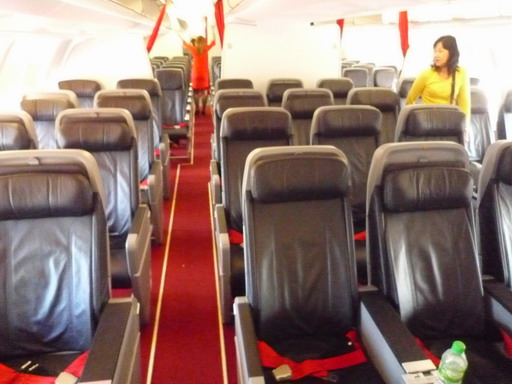 6.機位統一化:廉價航空能在競爭激烈的市場當中存活,所倚賴的就是高承載率。高承載率除了先採用低廉的票價吸引顧客之後,另一邊就是完全的利用原本機艙內所能乘載的空間。以亞航為例,機艙內除了前座的加大座位外,全數均為經濟艙的座位。