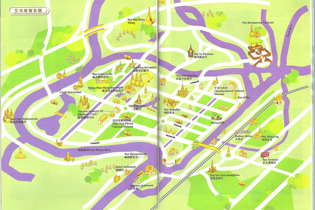 而大城的地圖在許多地方其實都可以拿得到,我使用的是之前在客棧下載的版本,個人覺得相當的好用。圖中已經將整個大城重要的景點標示的相當清楚了,會遠比當地所給的黑白影印好一點(現在或許會好一點?)。也因為地圖上已經畫得相當清楚,所以此篇就不會針對哪邊好玩、哪邊漂亮、哪邊值得一看做研究了,反正地圖在手,想怎麼走就交給各位朋友了,每個景點都有特別的意義,如果真的在意哪些是must go的話,可以參見背包客棧的內泰國部分的大城攻略,裡面都有更多完整的介紹。