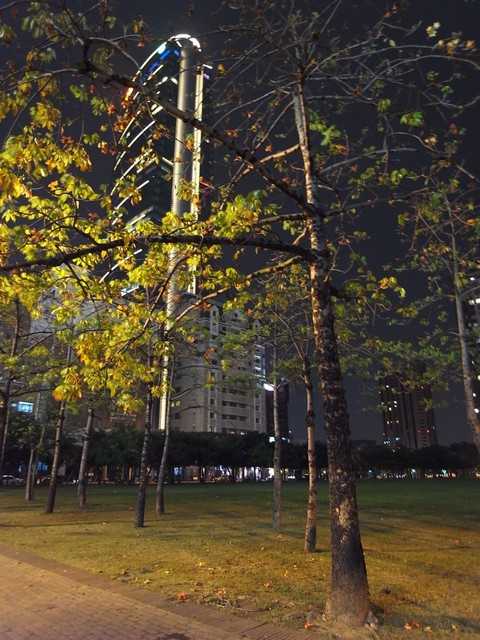 我走在對面的行道樹下,燈光不算是明亮,交錯的樹影在草皮上構印成棋盤式的方格,偶有幾片昏黃的樹葉飄下。