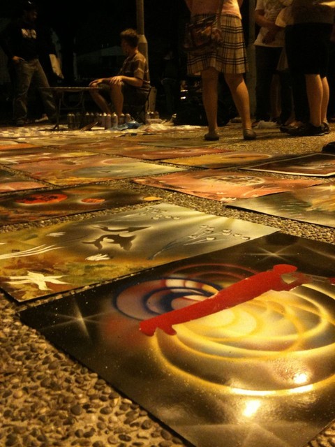 表演者利用噴漆和一些物品,在畫板上利用不同角度和技巧來表現景物。