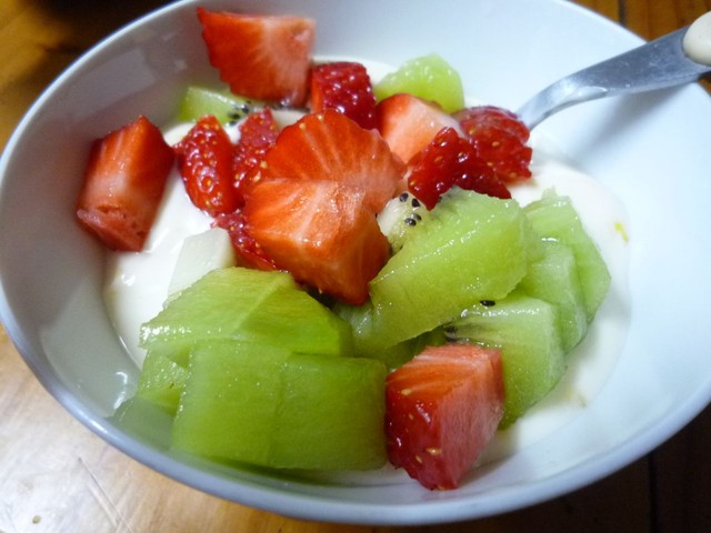 水果優格配上對比顏色強烈、讓人垂唌欲滴的草莓與奇異果...