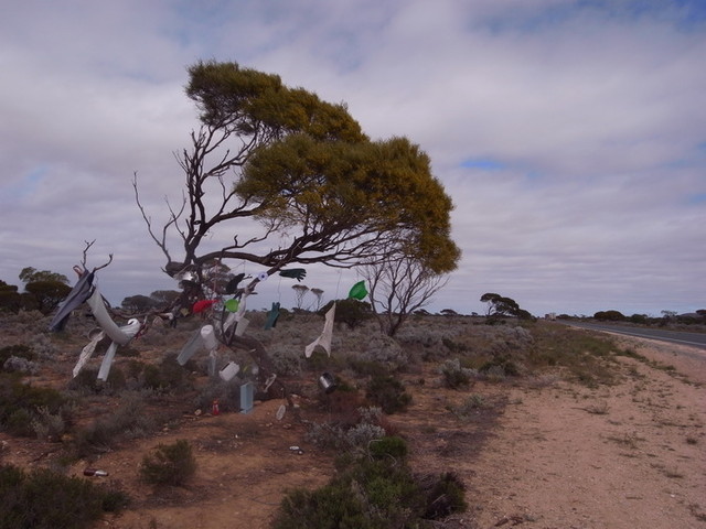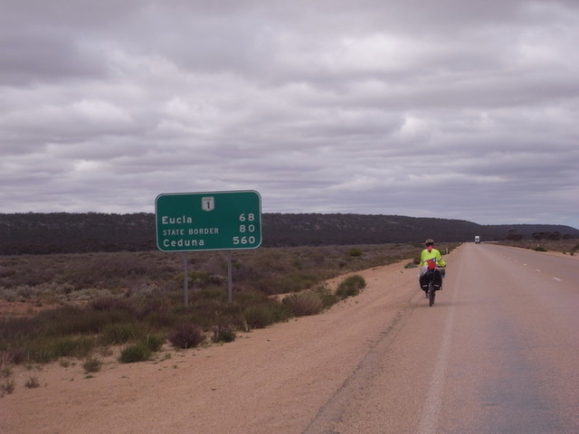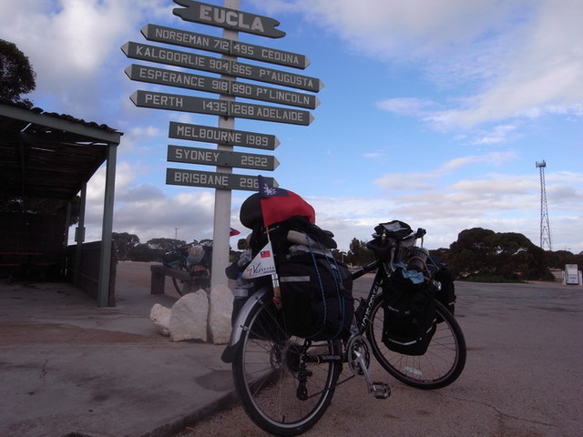 Eulca的設備相當的齊全,或許是從Balladonia離開之後最完善的一間休息站。氛圍很棒的餐廳、居高臨下遼闊的景色,而且從營地往下走四公里也會看見舊有電報站的遺跡與海灘,露營的人數也相當的多。但,碼表上所顯示的194公里實在讓我們沒有心思停留在Ecula,跨越邊界的急切與Border Village中與度假島嶼中相同字眼『Village』不自覺的聯想...。揀了幾顆石頭作紀念和在John Eyre的紀念碑前匆匆的拍了幾張照片後,我們決定把剩下的12公里騎玩,好讓碼表上的數字一舉突破兩百大關,順便一舉跨越兩州的邊界。
