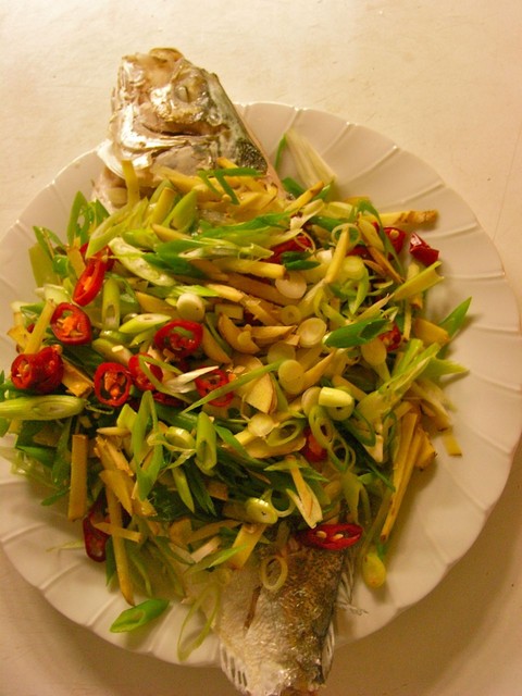 把蔥、薑、蒜、辣椒切絲切段後平鋪在蒸好的白鯧魚上,